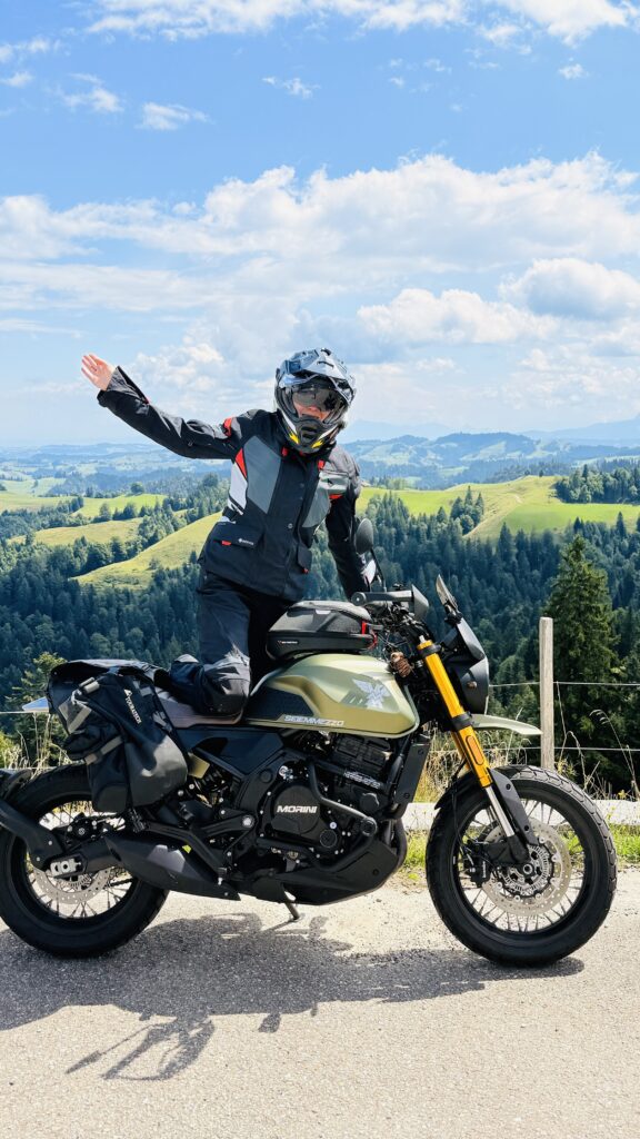 Ihre ersten Kilometer auf zwei Rädern sammelte Paulina auf einer kleinen Honda Rebel 125. Weil ihr damals die Gemeinschaft fehlte, legte sie das Hobby eine Zeit lang beiseite. Mit ihrem Umzug in die Schweiz im Jahr 2023 entdeckte sie die Leidenschaft neu: Heute ist sie mit ihrer Moto Morini Seiemmezzo Scrambler unterwegs.